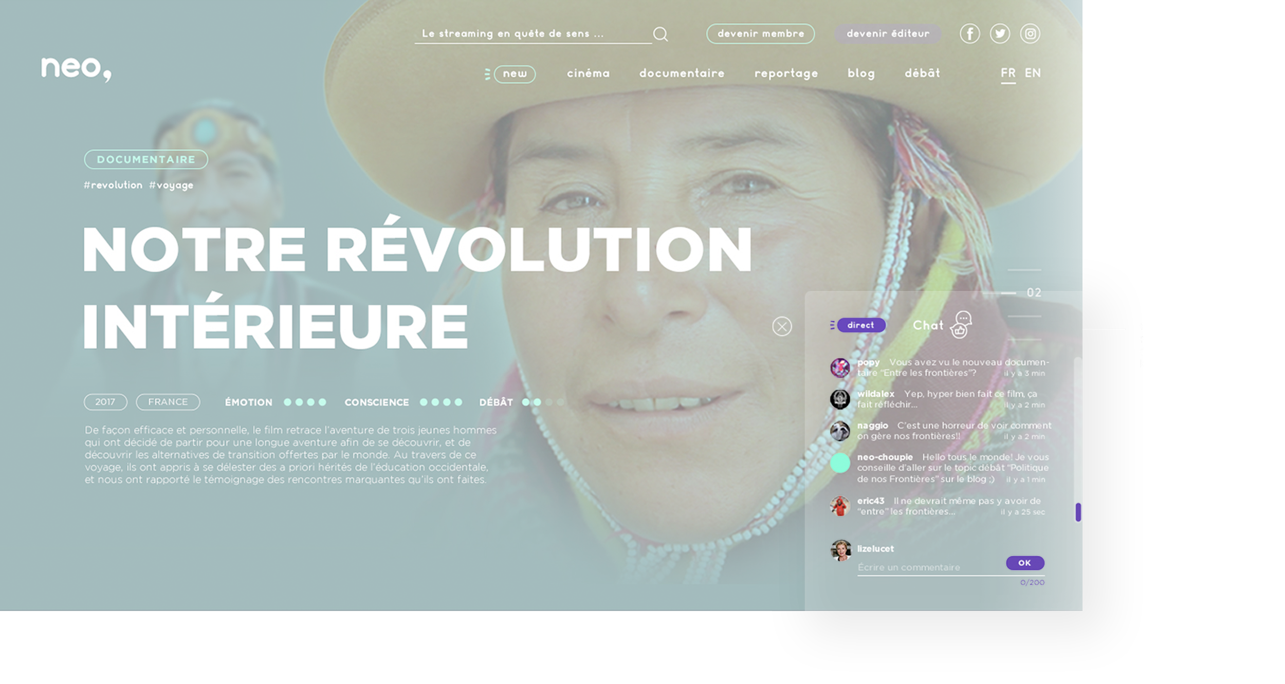 Neo is purpose-driven streaming that connects a diverse "commuNEOty" through two main sections: a blog and live debates, linking content with context—entertainment moments paired with intellectual exchange. The platform also includes a live chat and precise filters to ensure intuitive, dynamic navigation, all within a dark, gradient-themed interface designed for user comfort.