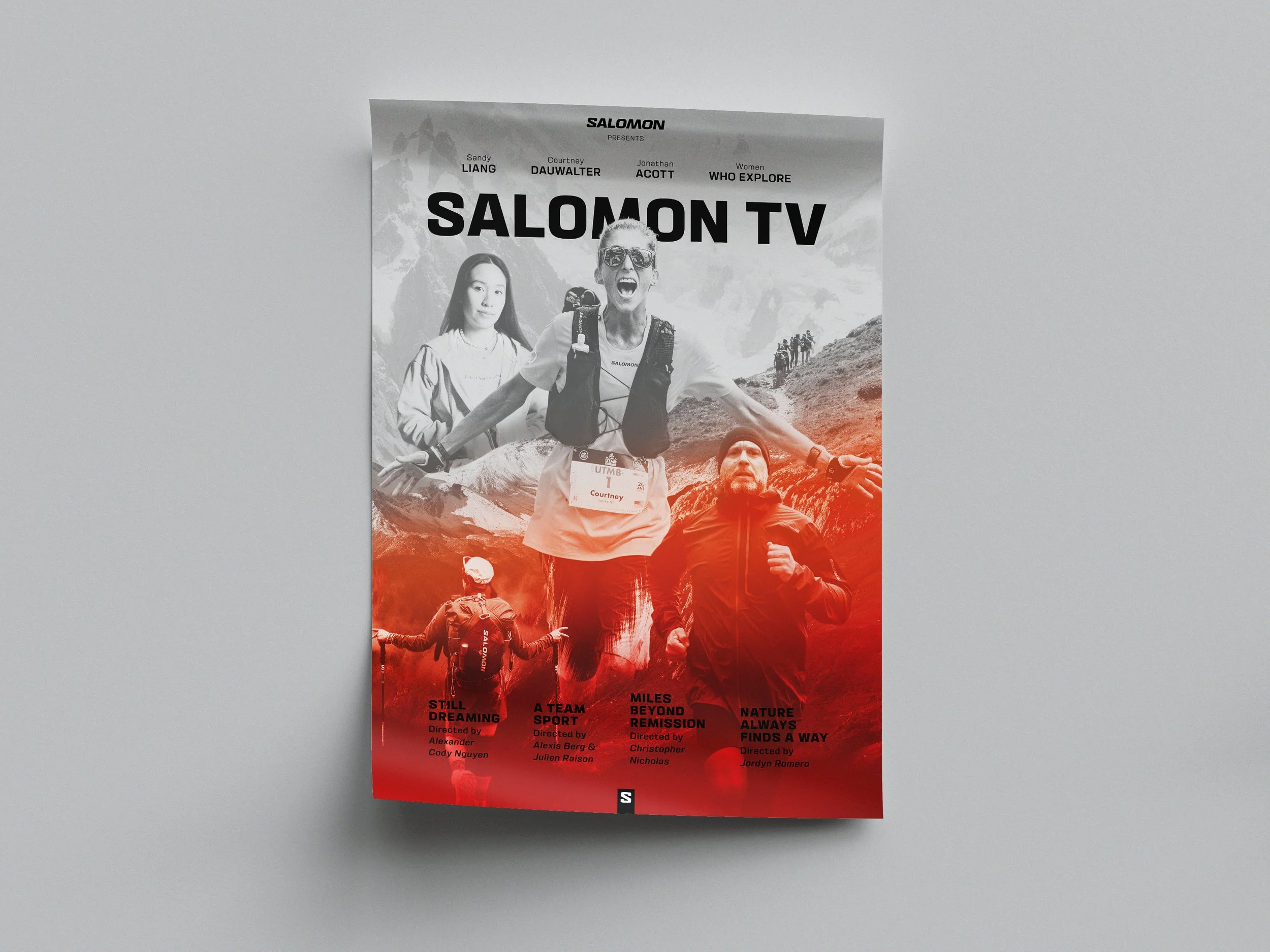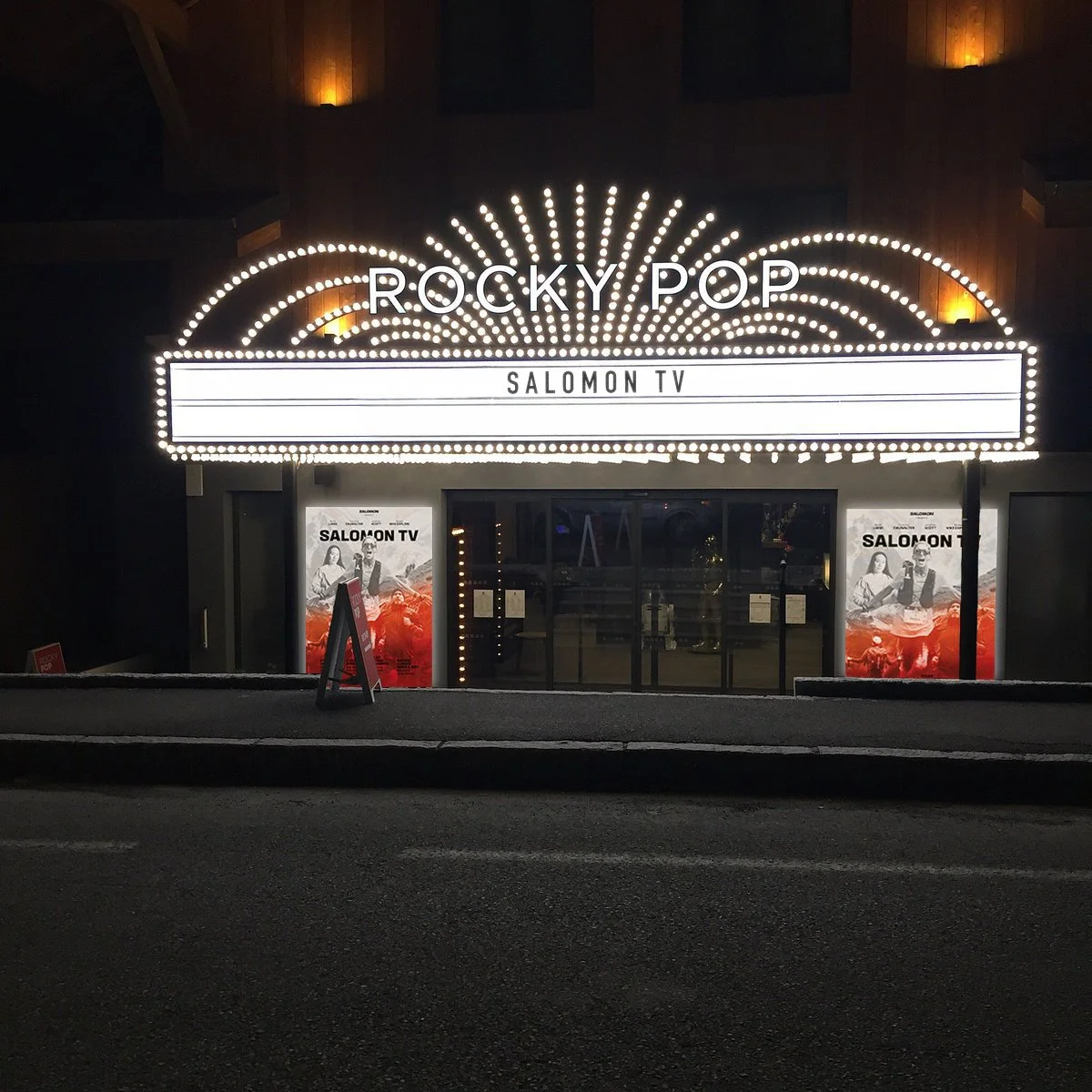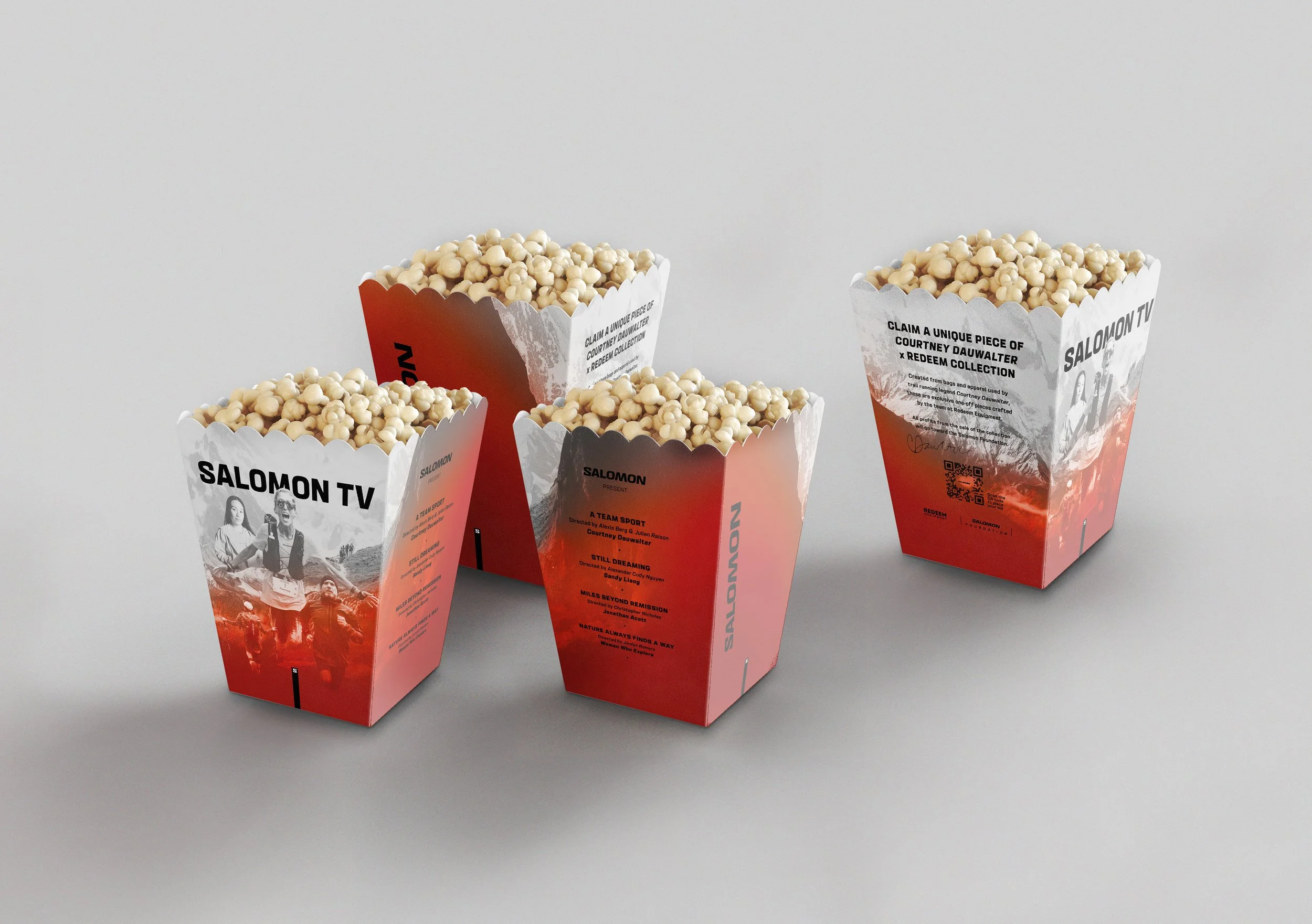 Design of a cinema poster and custom popcorn packaging for the Salomon TV broadcast at the Rocky Pop cinema in Chamonix.