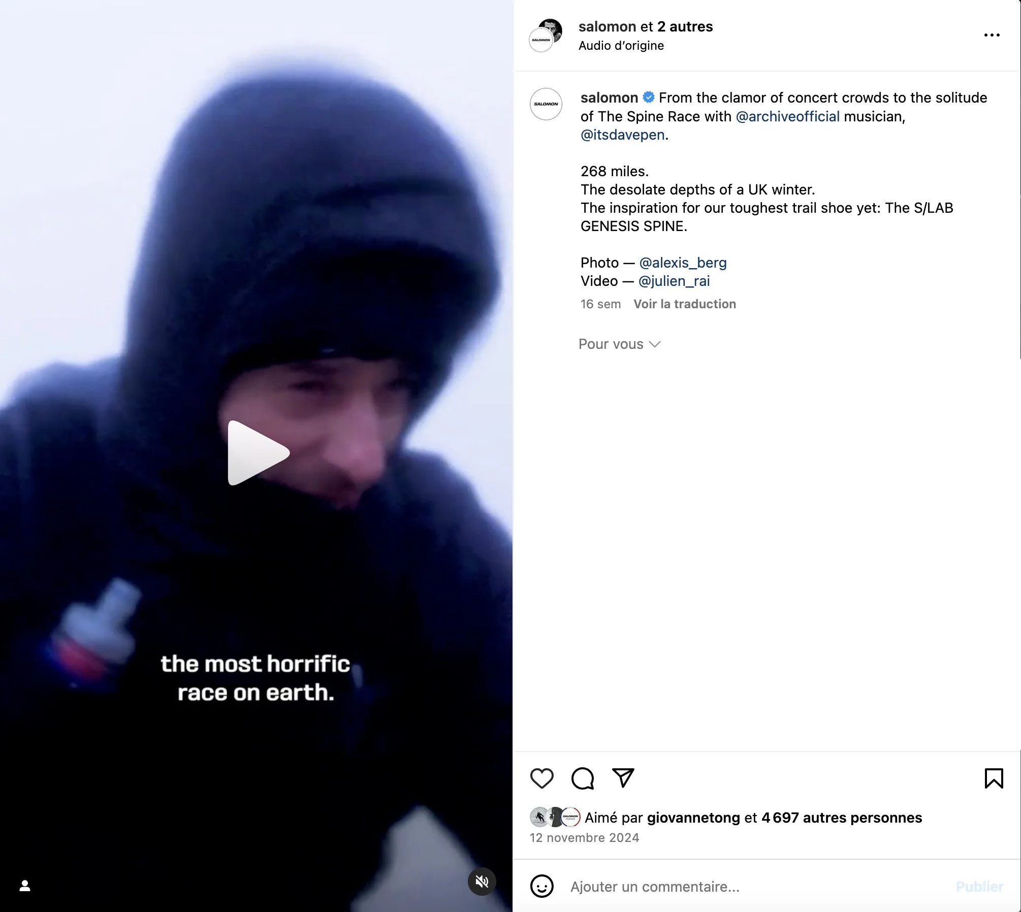 The campaign was produced with Dave Penn, filmed on the trails of the Spine Race, a 268-mile ultramarathon between England and Scotland along the Pennine Way, in which he participated.
