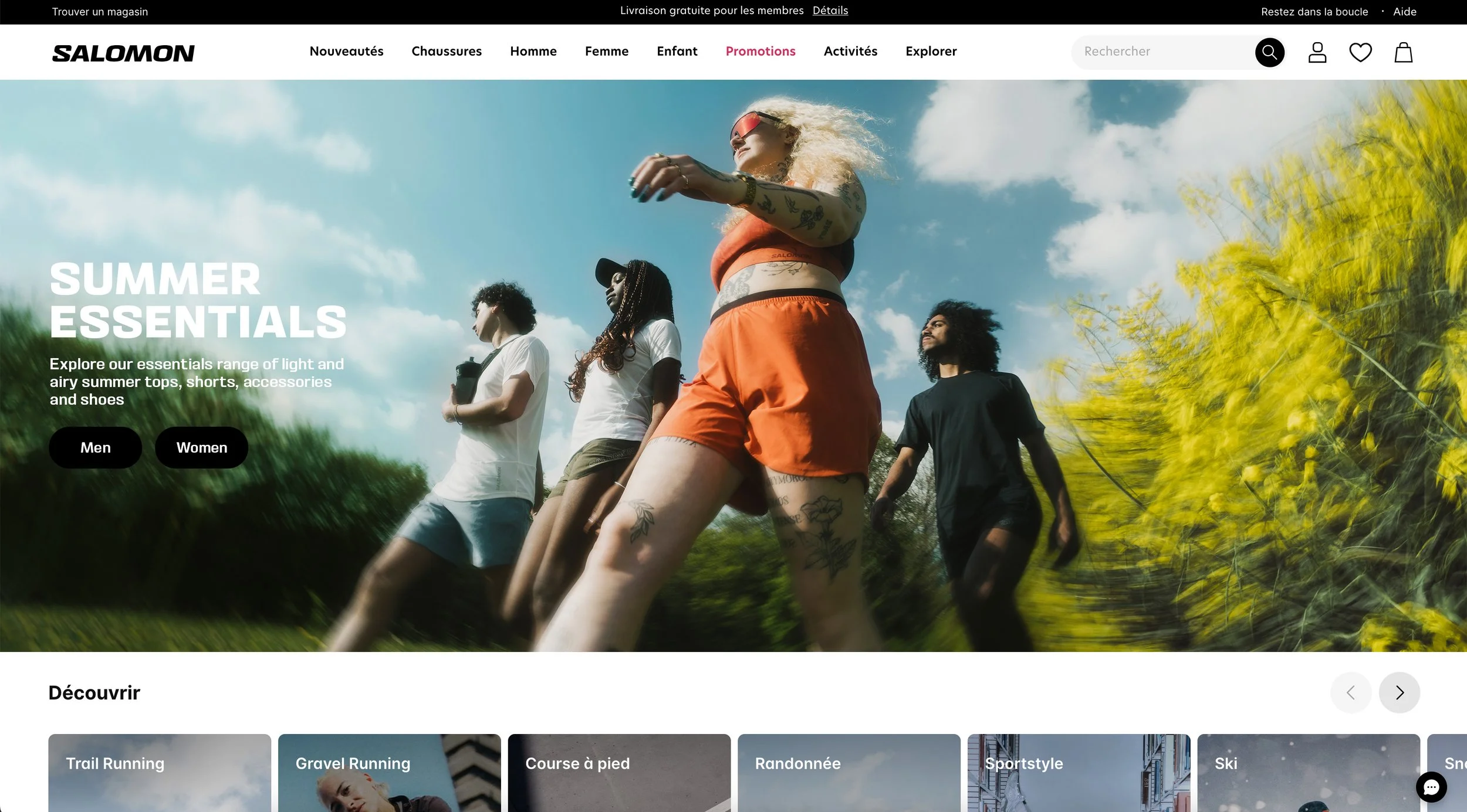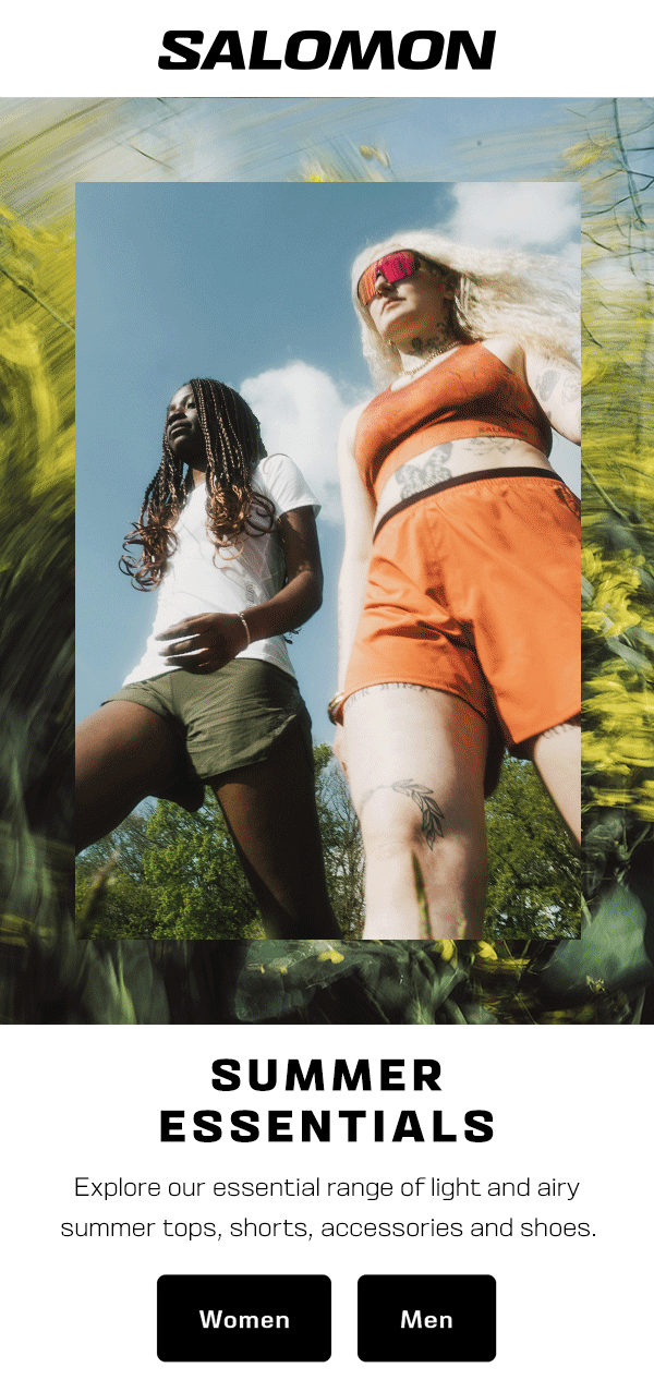 Create a campaign for the Salomon e-commerce site focusing on Summer Essentials. The goal is to showcase summer outfits that are versatile enough to be worn both in the city and outdoor, targeting a young audience.